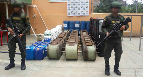 Mediante acciones de control adelantadas por personal del Escuadrón Móvil de Carabineros fueron incautados 42 bultos de bórax pentahydrate, 180 esferas de manganeso, una caneca que contenía 50 kilogramos de zinc, 41 canecas con peróxido de hidrógeno, 10 canecas de 35 kilogramos con ácido nítrico, 10 canecas de 50 kilogramos con cianuro, 30 cocos metálicos, seis ladrillos de cerámica, un bulto de 25 kilogramos de concreto refractario, insumos químicos que posteriormente fueron dejados a disposición de la Inspección Municipal de Buriticá. En el hecho no se registraron capturas entre tanto continúan las acciones para garantizar la estabilidad de los ecosistemas. Con la incautación de las sustancias, la Dirección de Carabineros y Seguridad Rural de la Policía demuestra su compromiso con el medio ambiente.