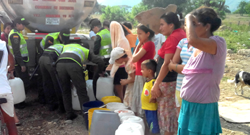 La Policía Nacional abasteció de líquido potable a las familias que llevan más de cuatro meses de escases.Unidades de efectivos adscritos al Escuadrón Móvil Antidisturbios (Esmad), con su vehículo de antimotines o tanqueta, adelantaron una labor humanitaria en los barrios: Los Guanes, San Martín, Las Nieves, el Centro, Milagroso; Perpetuo Socorro, Altamira, Miraflores y Chiquinquirá, donde suministraron agua a 11.200 personas aproximadamente, quienes se beneficiaron del preciado líquido.Es de anotar que quienes sufren el flagelo de la sequía son los habitantes ubicados geográficamente al del norte del País, siendo perjudicada la población de este municipio en cuanto a su agricultura y labores ganaderas, así como en sus actividades diarias por lo que se ven obligados al racionamiento intenso del líquido.La Policía Nacional invita a la ciudadanía en general, para que exista conciencia sobre el ahorro del agua en nuestros hogares, así mismo para no malgastar este elemento valioso para nuestras vidas, recordando siempre la frase célebre: "El agua es Vida, ahórrala"​