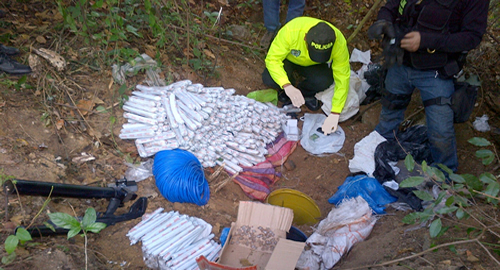 Bogotá, D.C. Uniformados de la Dirección de Investigación Criminal e interpol de la Policía a través de actividades de policía judicial se incautaron de un arsenal de guerra perteneciente a la segunda compañía 'Eyiber González' de la columna móvil 'Teófilo Forero Castro' de las Farc.El Grupo Investigativo contra las bandas criminales de la Dijín, estableció que la estructura terrorista bajo el mando de alias "El Paisa" ordenó cometer una escalada terrorista a nivel nacional contra instalaciones gubernamentales y de la fuerza pública.Como resultado del proceso investigativo fue ubicada en la vereda Potosy, zona rural del municipio Campoalegre una caleta en cuyo interior fue hallado material explosivo de alto poder destructivo conformado por 3830 barras de indugel, 500 metros de cordón detonante; 100 metros de mecha lenta; 100 detonadores eléctricos y 50 ineléctricos; un dispositivo celular y otro tipo reloj, un mortero de 60 milímetros y un lanza granadas de 40 milímetros.Además del material explosivo, con capacidad para destruir en un radio de 500 metros a la redonda, fueron incautadas fotografías satelitales de algunos municipios del sur del país con las cuales las Farc planeaban sendos ataques terroristas.La segunda compañía denominada 'Ayiber González' pertenecientes a la Columna Móvil 'Teófilo Forero Castro' de las Farc, hace presencia criminal en los municipios de Campoalegre, Algeciras y la Rivera departamento del Huila, en esta zona su cabecilla principal es Franklin González Ramírez alias 'Rodolfo' o 'corcho', especialista en manejo de explosivos, esto le permite planear y ejecutar acciones terroristas dirigidas a la población civil y la fuerza pública.