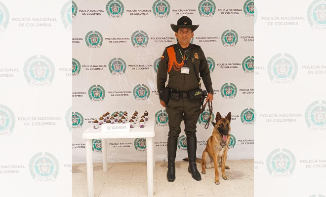 En un esfuerzo conjunto con el canino de detección de sustancias narcóticas de nombre 'Toto', en una minuciosa inspección se descubrió en un paquete más de 20 frascos de ketamina, un anestésico general de uso veterinario.