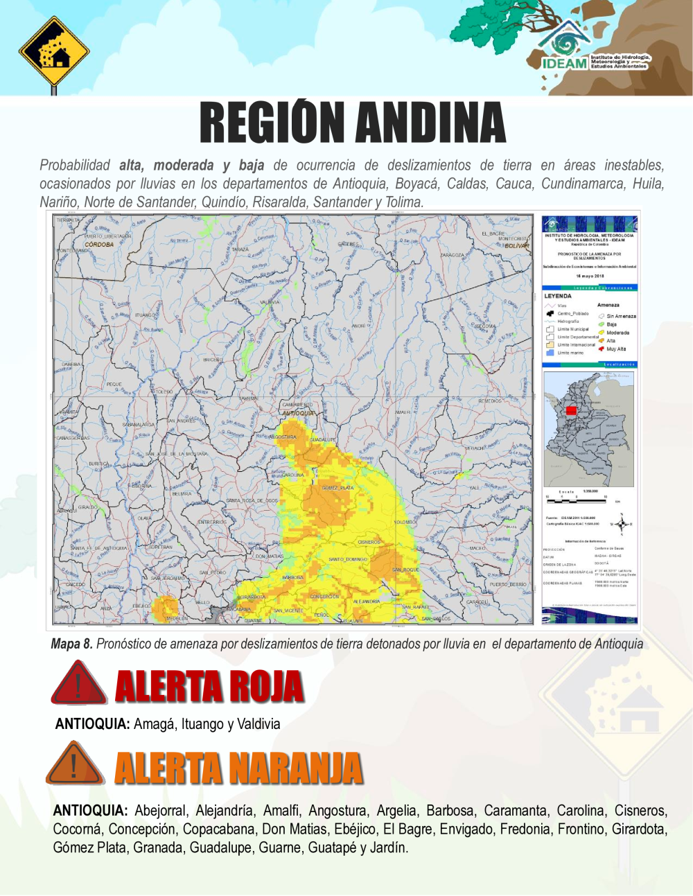 El servicio de Seguimiento y Pronóstico de la amenaza diaria por deslizamientos, tiene como objeto proveer información oportuna acerca de la probabilidad de ocurrencia de deslizamientos asociados a lluvias, es importante destacar que para el IDEAM el término “Deslizamientos” se utiliza de modo genérico e incluye a los movimientos en masa definidos como todo desplazamiento hacia abajo (vertical o inclinado en dirección del pie de una ladera) de un volumen de material litológico (roca, formación superficial o suelo) importante, en el cual el principal agente es la gravedad y que puede o no incluir el efecto del agua (IDEAM, 2004).