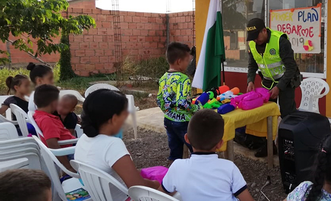 Con el propósito de desestimular la violencia desde la juventud, el Departamento de Policía Meta en el marco de la segunda fase del “Plan de Choque, más cerca del ciudadano”, llevó cabo el ‘primer plan desarme del 2019’ en el municipio de Puerto Rico, logrando la recepción de 22 juguetes bélicos, entregados de manera voluntaria por niños y niñas, a quienes, el gestor de prevención y educación ciudadana de la Estación de Policía Puerto Rico les entregó juegos didácticos por su aporte y compromiso en la construcción de una ‘Democracia Segura’.