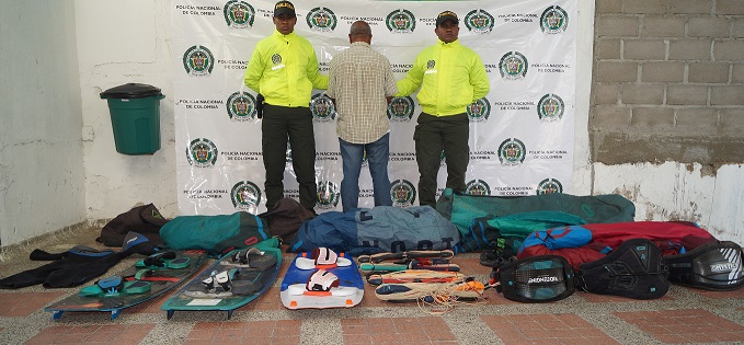 El Departamento de Policía Guajira materializa la captura de una persona luego de realizar un registro y allanamiento en el sector de la calle 10 barrio arriba, donde se hallaron los elementos que habrían sido hurtado hace varios días a turistas dedicados a practicar deporte extremo en el mar.